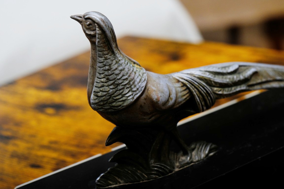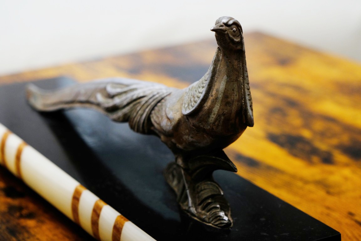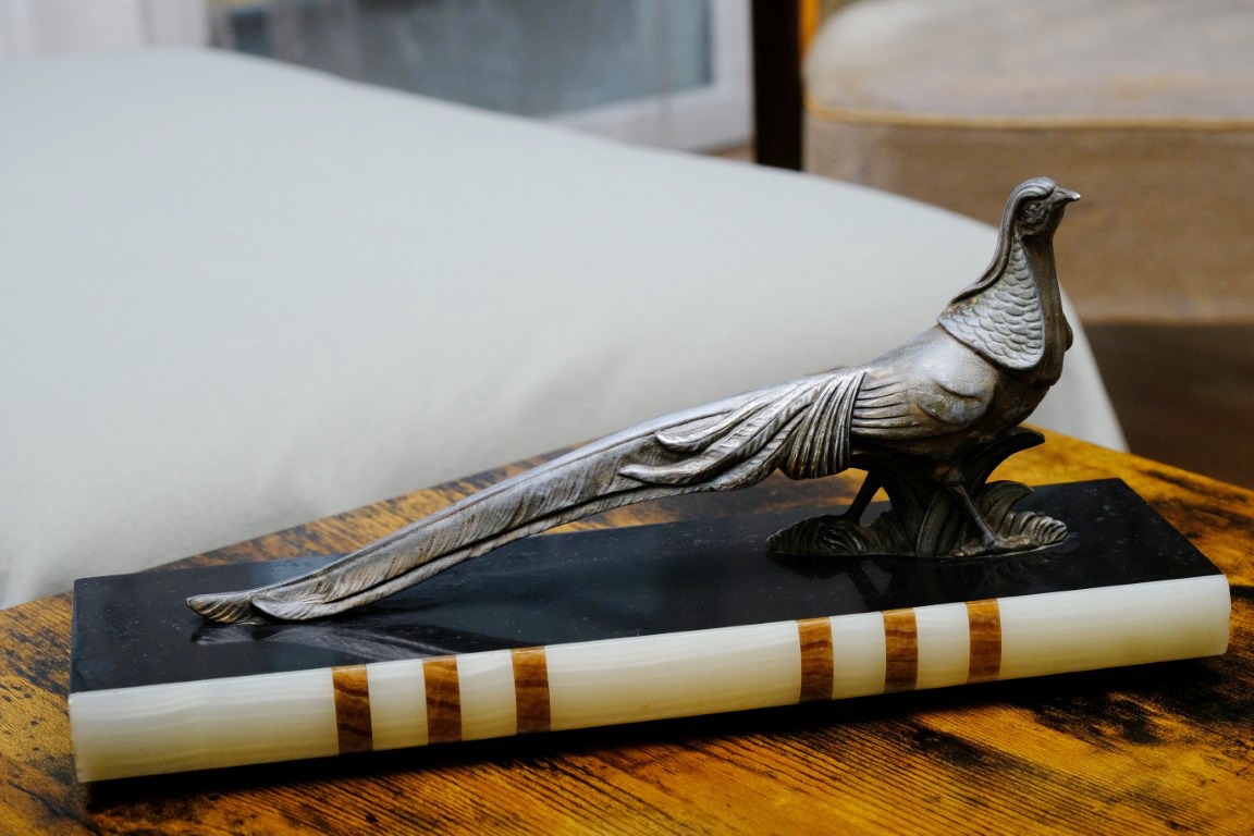 Pfau Skulptur (Bronze) | Französiches Art Deco | Auf Stein- und Onyxplatte